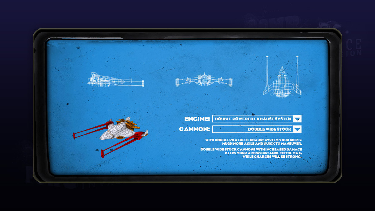 In collaboration with VICO Game Studio, I have designed various parts of the in-game user interface, established layout and style, and created assets for the upgrades screen, player HUD, level select screen, and the main menu. Work also included creating Title Screen, which can be found in the Graphic Design section, and modelling player's avatar spaceship, which you can find in the 3D section on the main page.