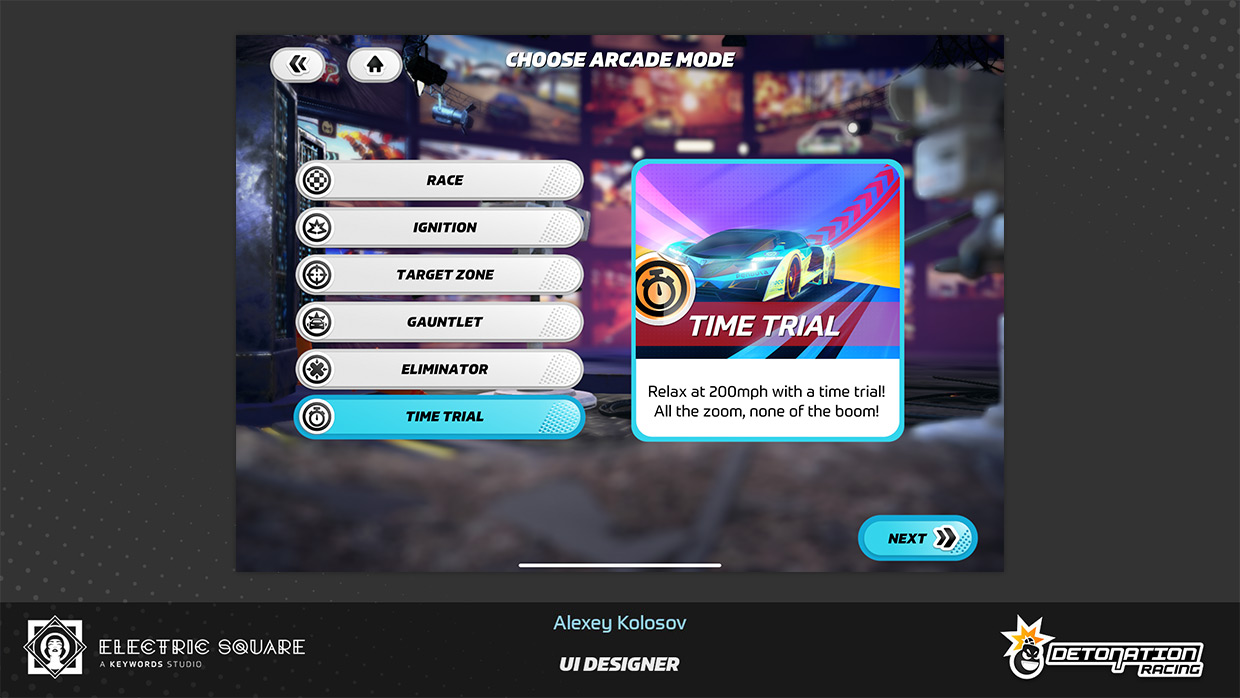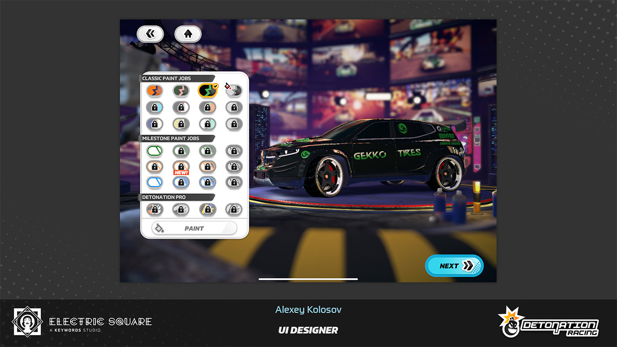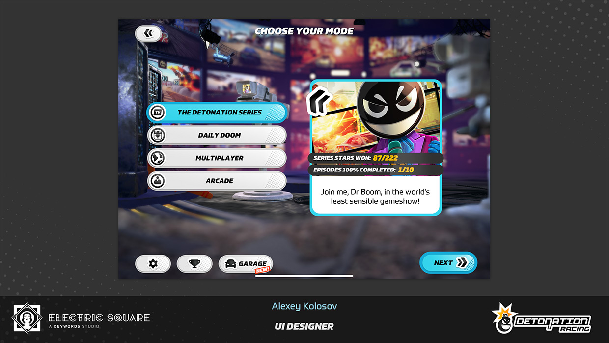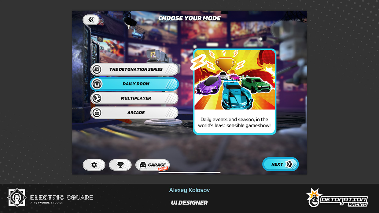 My work on Detonation Racing included updating user interface layout of several menus, fine-tuning interaction colour palette of the game, and creating new menu screens and assets. Some of this work can be found in UI Art section, on the main page. I have also contributed by editing a promotional game trailer and creating the game's first web page.