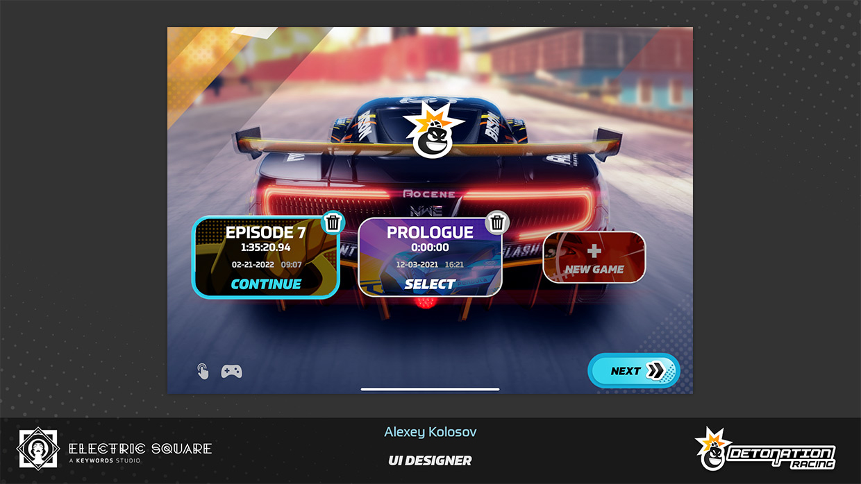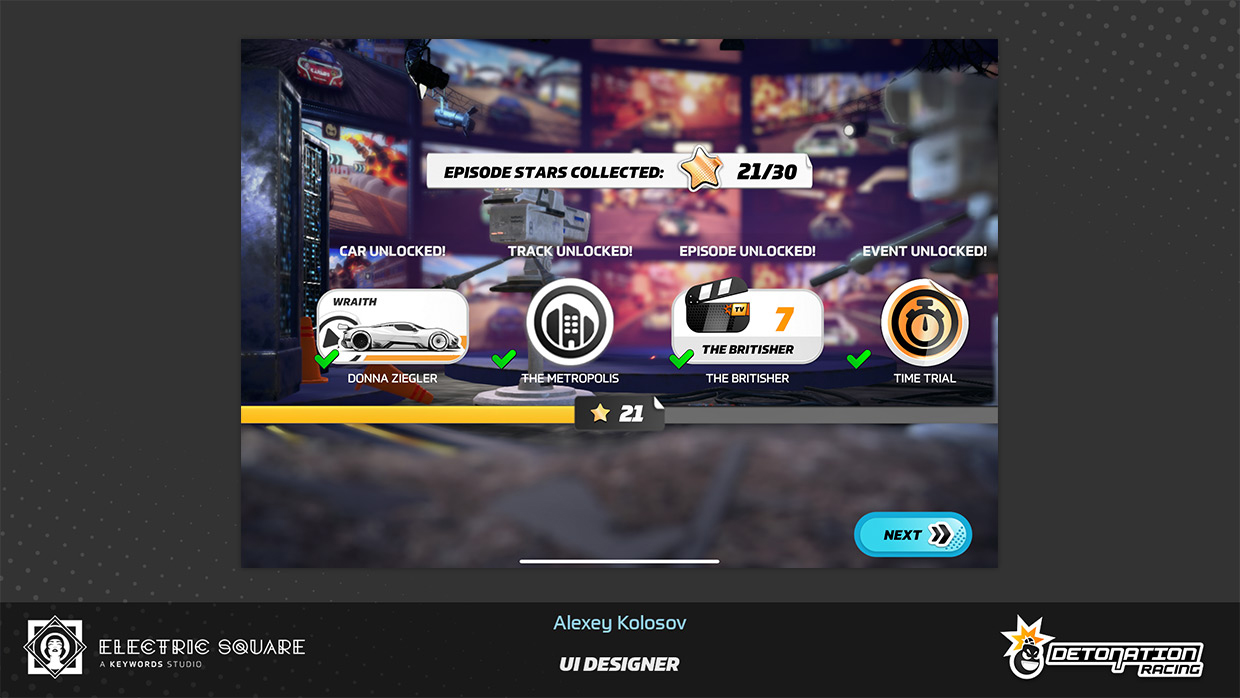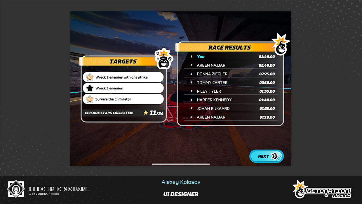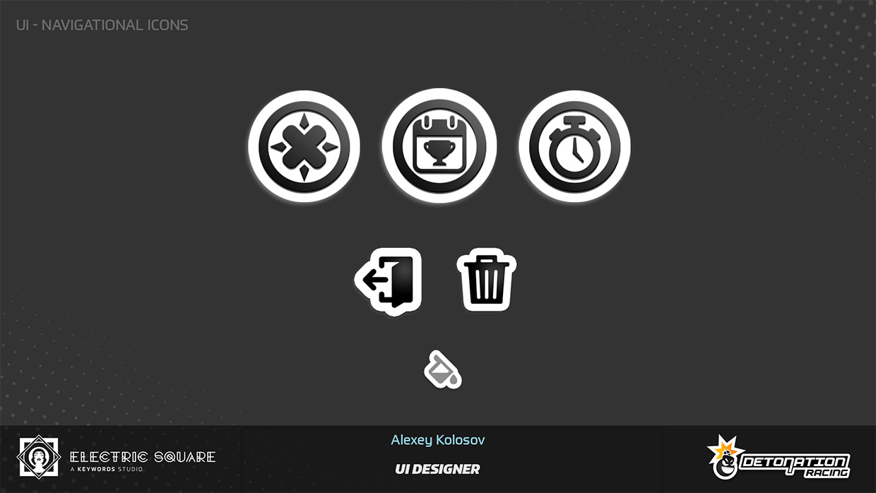 My work on Detonation Racing included updating user interface layout of several menus, fine-tuning interaction colour palette of the game, and creating new menu screens and assets. Some of this work can be found in UI Art section, on the main page. I have also contributed by editing a promotional game trailer and creating the game's first web page.