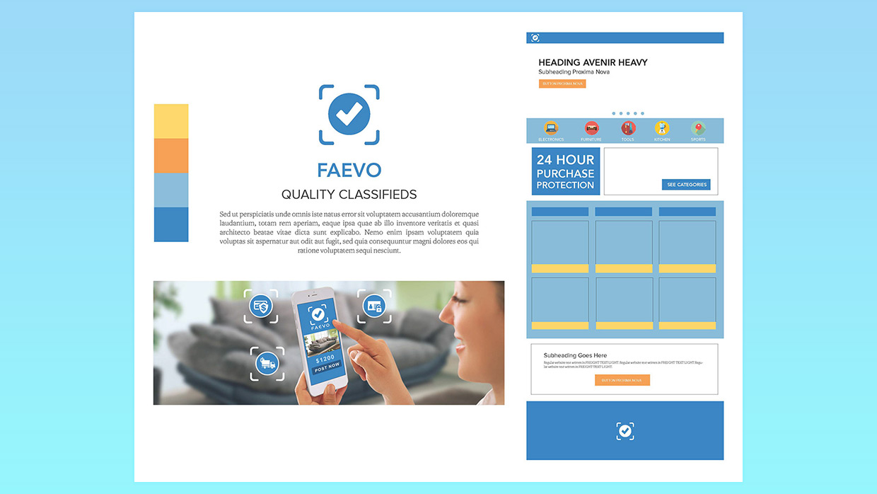 My contribution to the Faevo team included developing the app's logo, brand colours and fonts, app landing screens, with iconography, and landing web page layout.